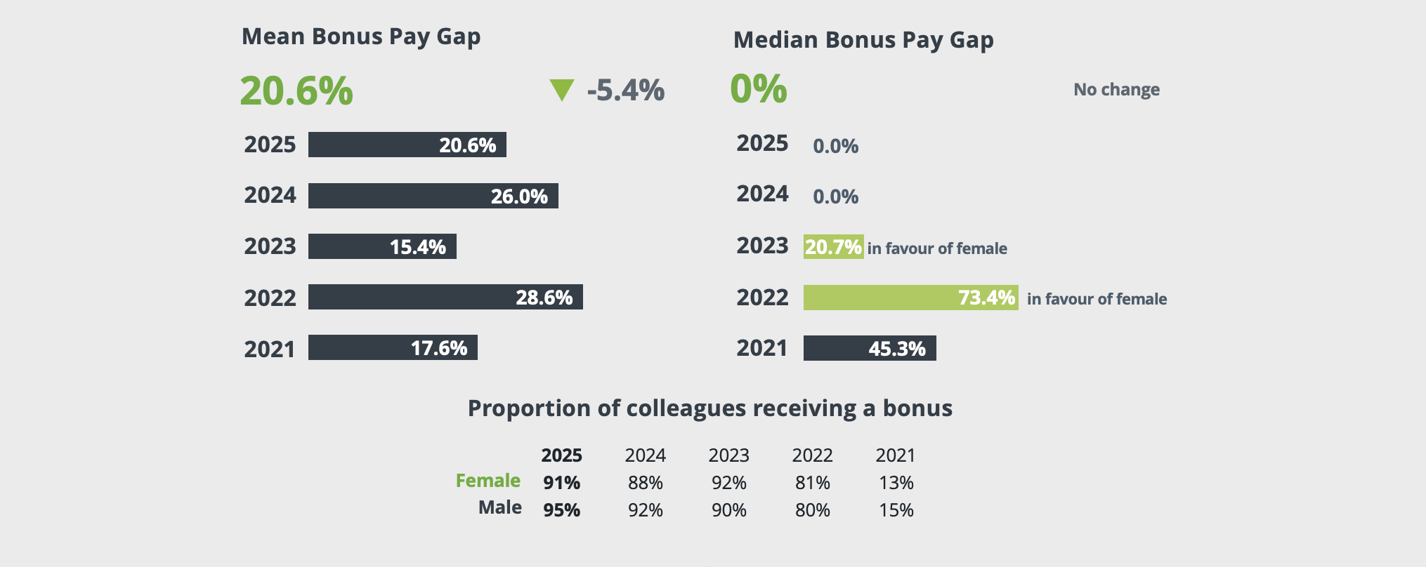 The mean gender bonus gap has improved, narrowing by 5.4%, and the median gender bonus pay gap remains unchanged at a neutral 0%.