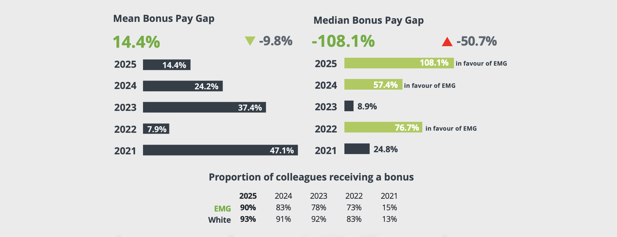 The median bonus gap is at 108.1% in favour of ethnic minority group colleagues. This is compared to 57.4% in favour of this group in 2024, meaning it’s even more so in favour of colleagues from an ethnic minority group.